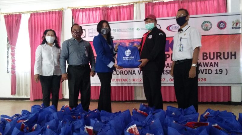 Penyerahan lima puluh paket sembako dari Bank Kalteng oleh Yulianson selaku kepala cabang utama wilayah Kalimantan Tengah, diterima secara simbolis oleh ketua Konfederasi Serikat Buruh Indonesia Wilayah Kalteng Kaliansyah disaksikan oleh pihak Disnakertrans Kalteng.