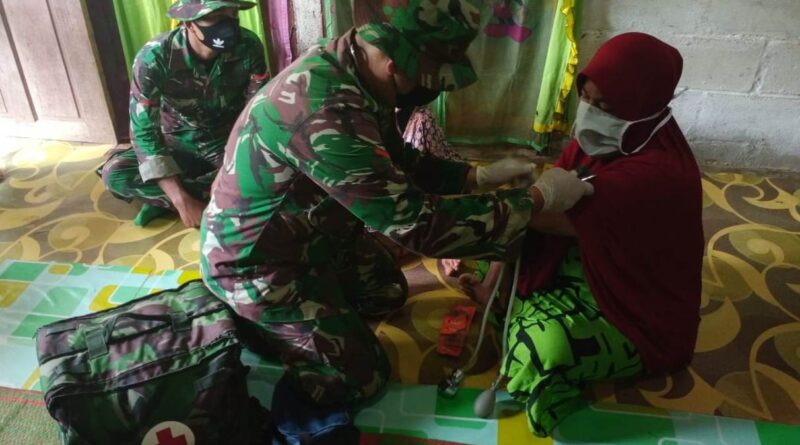 ACEH BARAT, MZK News – TNI Manunggal Membangun Desa (TMMD) Reg ke-108 TA. 2020 di wilayah Kodim 0105/Aceh Barat, Door To Door memberikan pelayanan obat-obatan gratis bagi masyarakat di desa Lango Kecamatan Pante Ceureumen Kabupaten Aceh Barat, Selasa (7/07/2020).