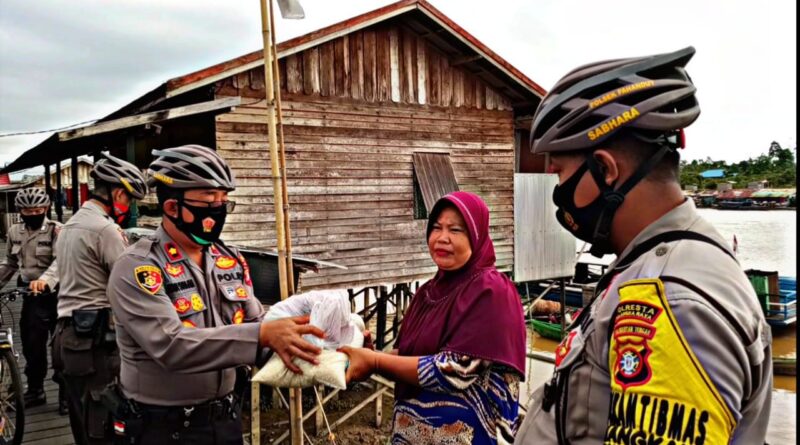 Patroli Bersepeda Polsek Pahandut Bantu Masyarakat Kurang Mampu Terdampak Covid-19