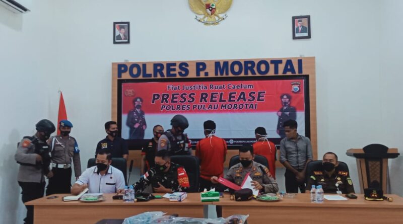 Morotai, MZK News – Polres Pulau Morotai Maluku Utara menggelar Press Release terkait pengungkapan kasus pencurian dan pejagalan ternak sapi. Kapolres Pulau Morotai, AKBP Aan Hardiansyah didampingi oleh Kasat Reskrim Iptu Kristofel saat jumpa persnya mengungkapkan pelaku pencurian dan penjagalan ternak sapi pada hari Minggu, (27/06) sekitar puluk 21.00 WIT. Aksi itu telah terjadi di kebun milik saudara Muksin Boleu asal Desa Sabala, yang dilakukan oleh 2 orang terduga pelaku berinisial FS dan YG adalah warga desa Sabatai Baru. pada Rabu (30/06).