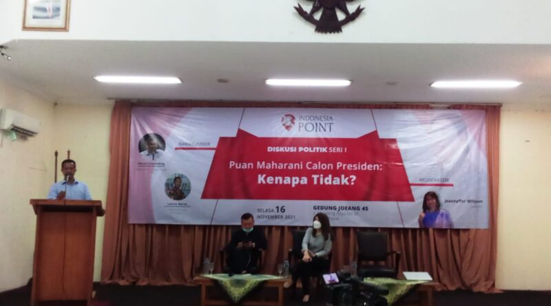 Jakarta, MZK News – Menjelang tahun politik 2024 Indonesia Point laksanakan Diskusi Politik Seri 1 dengan mengambil tema “Puan Maharani Calon Presiden Kenapa Tidak ?” yang bertempat di Gedung Joang 45 Jalan Menteng Raya No 31,Kebon Sirih, Jakarta Barat Diskusi politik ini juga dilakukan secara Zoom Meeting, dengan pembicara Emrus Sihombing analis komunikasi politik UPH dan Lucius Karkus peneliti senior Formappi dengan moderator Jeannyffer Willyam Jurnalis Metro Tv, Selasa (16/11/2021).