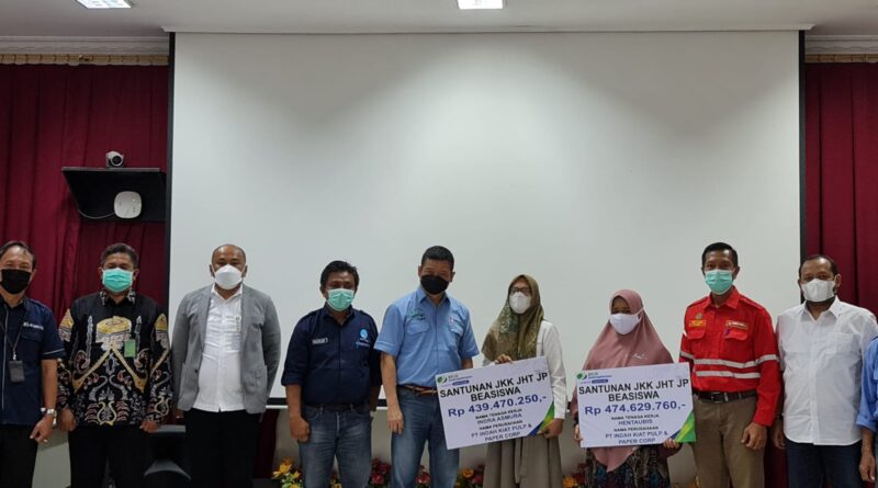 Hasanuddin selaku Direktur PT. IKPP didampingi oleh Deputi Direktur Wilayah BP Jamsostek Sumatra Barat, Riau dan kepulauan Riau (Sumbariaukepri) Eko Yuyulianda kepada penerima ahliwaris Januarita dan Laila Avivi yang merupakan istri almarhum di Kantor PT IKPP Perawang, Kabupaten Siak, Provinsi Riau Rabu (29/12/21).