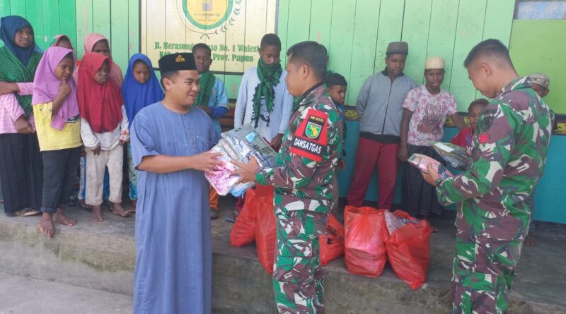 Satgas Kodim Yonif RK 751/VJS Bagikan Baju Koko dan Mukena pada Santri