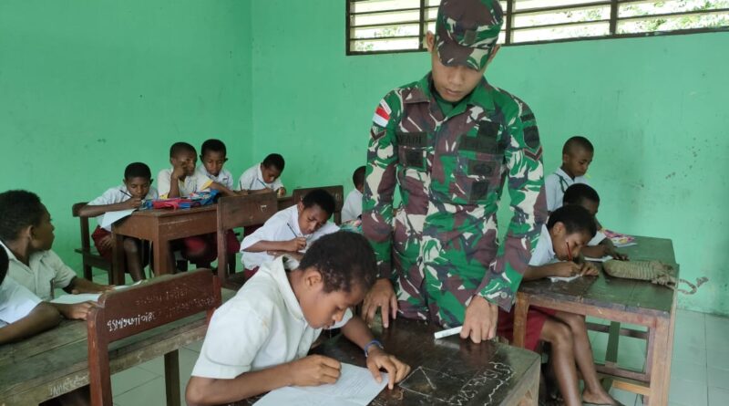 Keerom, MZK News – Anggota Satuan Tugas Pengamanan Perbatasan (Satgas Pamtas) Republik Indonesia-Papua Nugini Yonif 126/KC menjadi tenaga pendidik di SD Kanandega, Kampung Banda, Distrik Waris, Kabupaten Keerom.