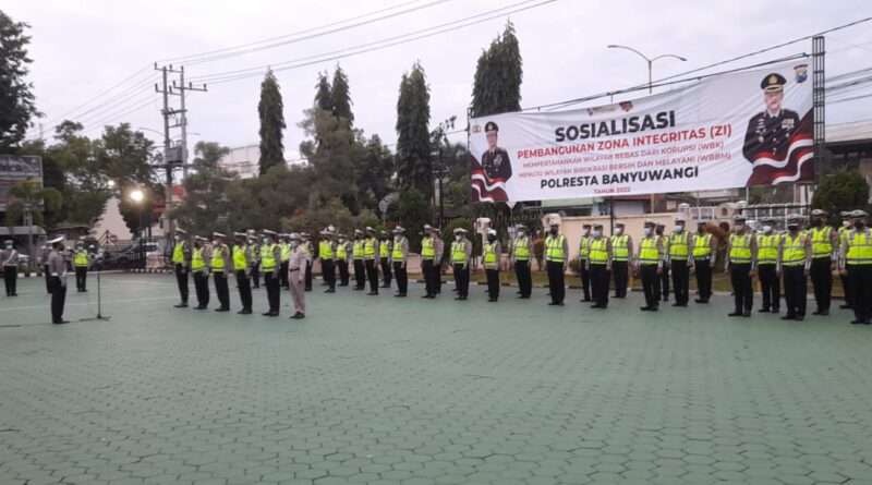 Banyuwangi, MZK News – Satuan Lalu Lintas Polresta Banyuwangi lakukan giat apel pagi dan pelayanan pengaturan pagi hari demi terciptanya Kamseltibcarlantas di halaman Polresta Banyuwangi, Rabu (9/02/2022).
