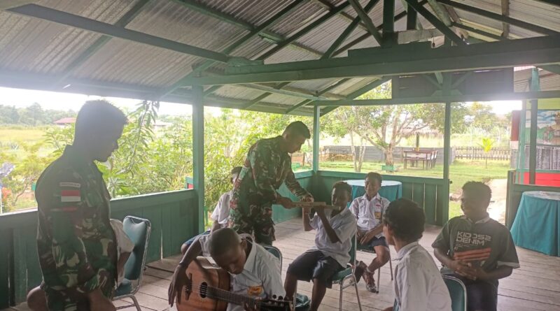 Keerom, MZK News – Personel Pos Kotis Satgas Pamtas RI-PNG Yonif 126/KC memberikan kursus kilat kepada siswa SMP Negeri 1 Senggi tentang cara bermain gitar dan seruling sebagai sarana hiburan, bertempat di Pos Senggi Satgas Yonif 126/KC, Distrik Senggi, Kabupaten Keerom.