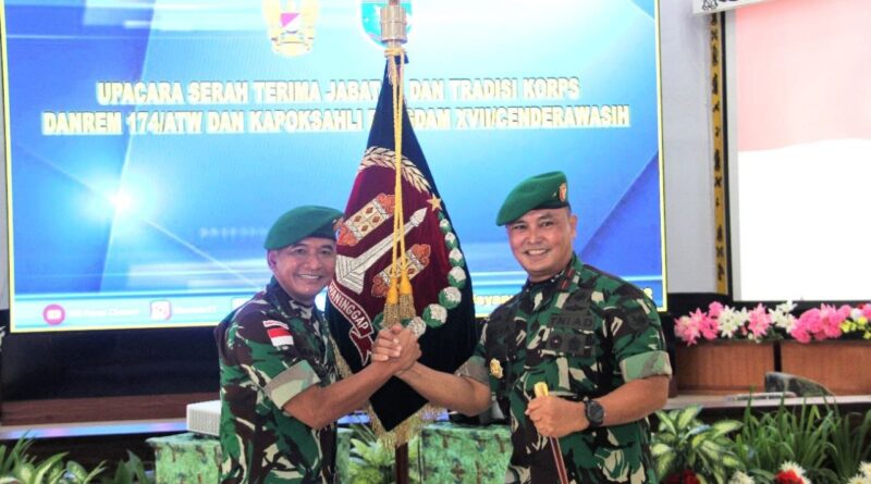 Merauke, MZK News – Panglima Kodam XVII/Cenderawasih Mayjen TNI Teguh Muji Angkasa, S.E., M.M., memimpin Serah Terima Jabatan dan Tradisi Korps Danrem 174/ATW Merauke dari Brigjen TNI Bangun Nawoko kepada pejabat baru Danrem 174/ATW Merauke Brigjen TNI Evi Reza Pahlevi, S.E., bertempat di Aula Tonny A. Rompis Makodam XVII/Cenderawasih, Rabu (09/02/2022).
