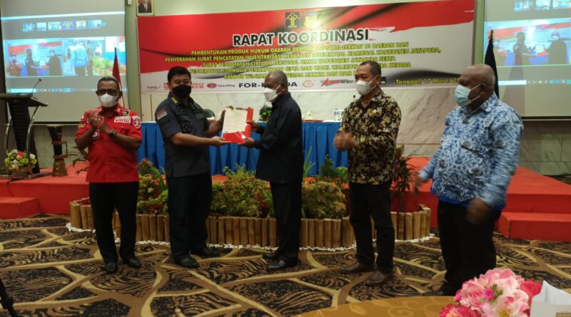 Penyerahan sertifikat penghargaan ini diberikan saat pelaksanaan Rapat Koordinasi Pembentukan Produk Hukum Daerah dengan Instansi Terkait di Daerah, Penyerahan Surat Pencatatan Inventarisasi Kekayaan Intelektual Komunal dan Surat Pencatatan Ciptaan Personal UMKM, serta Penyerahan Formulir Pendaftaran Cipta dari Walikota Jayapura kepada Kantor Wilayah Kementerian Hukum dan HAM Papua, yang berlangsung di Grand Abe Hotel, Distrik Abepura, Kota Jayapura, Papua, Kamis (17/3/2022) pagi.