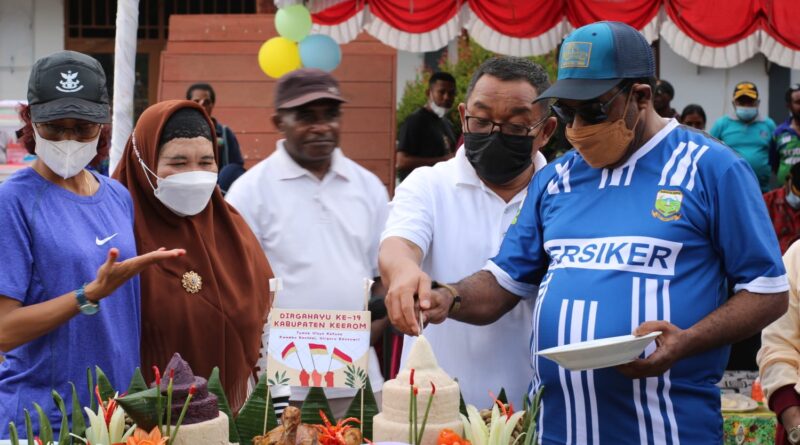 Foto: Bupati Keerom memotong nasi tumpeng dalam peringatan HUT ke 19 Kabupaten Keerom (Foto: IST)