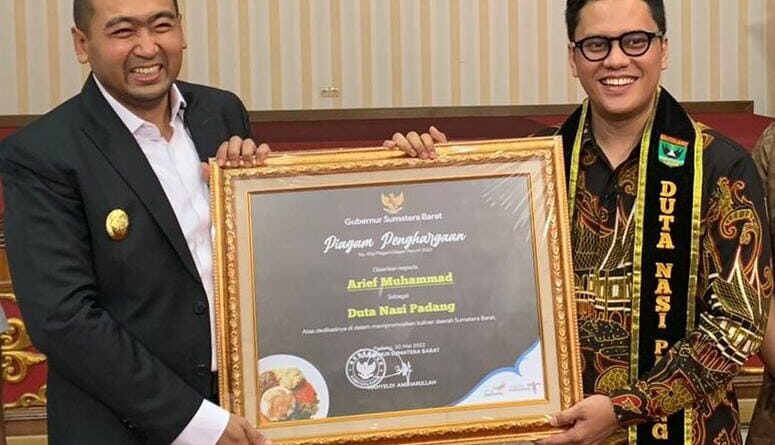 Datang memenuhi panggilan, Audy Joinaldy, Jum’at (20/5), pemanggilan Arief Muhammad ternyata untuk dinobatkan oleh Pemerintah Provinsi Sumatra Barat sebagai Duta Nasi Padang. Audy mengatakan, Arief Muhammad sebagai orang Minangkabau di rantau telah banyak berkontribusi mempromosikan Sumatra Barat, terutama Nasi Padang.