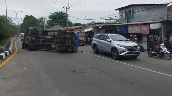 Foto: Truk yang mengalami kecelakaan terguling di Jalan Bubulak Kota Bogor (Foto: IST)