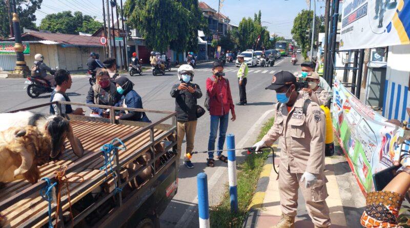 Foto: Petugas dari tim gabungan sedang menyemprot dan mengecek kendaraan yang membawa hewan ternak (Foto: IST)