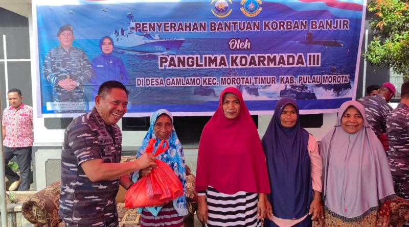 Morotai, MZK News – Panglima Koarmada (Pangkoarmada) III LAKSDA TNI Irvansyah memberikan bantuan berupa Sembilan Bahan Pokok (Sembako) dan Perlengkapan Rumah Tangga kepada Masyarakat Desa Gamlamo yang pernah terkena dampak bencana alam banjir beberapa waktu lalu.