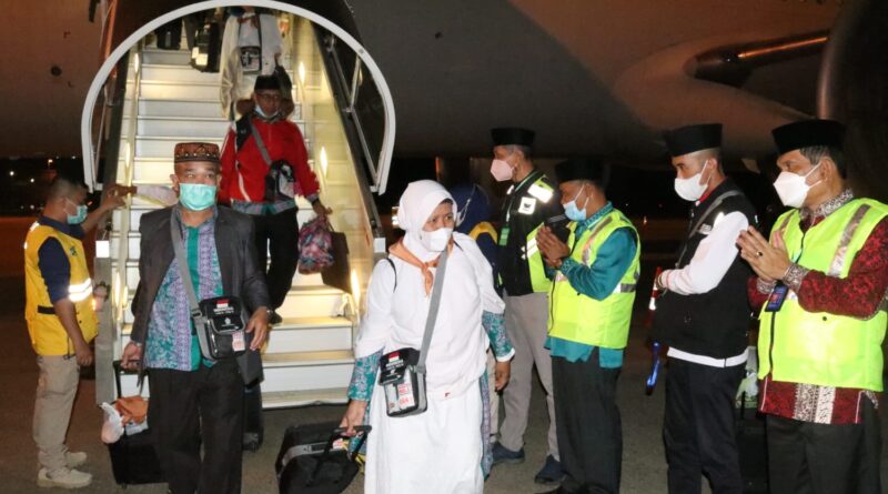 “Selamat datang dan selamat kembali ke Tanah Air. Semoga perjalanan haji yang bapak ibu lalui dapat diterima oleh Allah serta memperoleh haji mabrur,” ucap Ka. Kanwil.