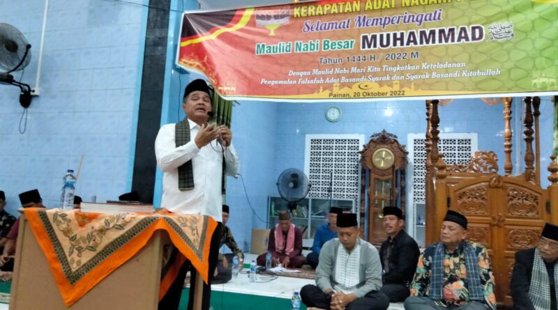Painan, MZK News – Kerapatan Adat Nagari (KAN) Painan, Kecamatan IV Jurai, Kabupaten Pesisir Selatan, memperingati Maulid Nabi Muhammad SAW 1444 H dengan tausiyah dan tradisi Makan Bajamba di Mesjid Raya Painan, Kamis (20/10/2022) malam.