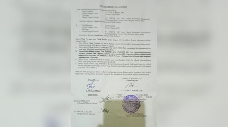 Bima, MZK News – Kasus penganiayaan Aulya yang diduga dilakukan Mustakim serta kasus penganiyaan Mustakim yang diduga dilakukan Ikra warga Desa Campa, Kecamatan Madapangga, Kabupaten Bima, Nusa Tenggara Barat (NTB) yang terjadi pada Kamis, 3 November 2022, siang kemarin berujung islah (damai).