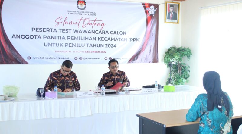 “Dalam proses wawancara sebanyak 227 calon PPK dibagi selama 3 hari dengan 5 Kecamatan per hari. Untuk hari pertama dilaksanakan untuk Kecamatan Blambangan Umpu Negeri Agung, Negeri Besar, Rebang tangkas dan Kasui. Tanggal 12 Desember untuk Kecamatan Baradatu, Pakuan Ratu, Negara Batin, Way tuba dan Gunung Labuhan. Tanggal 13 Desember untuk kecamatan Umpu Semenguk, Bumi Agung, Buay bahuga, Bahuga dan banjit,” ujar Tri Sudarto.