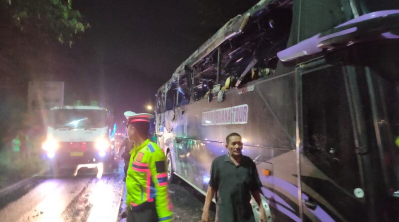 Foto: Bus Pariwisata PT Dzakki Buana Tour yang mengalami kebakaran serta personil kepolisian sedang mengatur lalu lintas (Foto: IST)