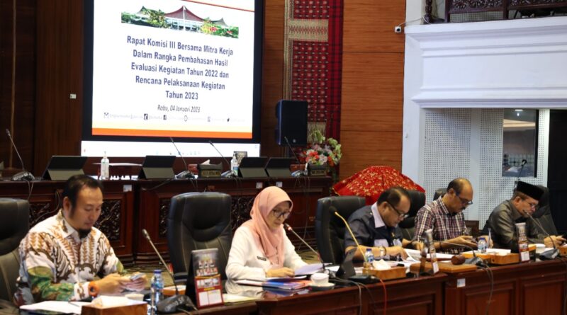 Padang, MZK News – Komisi III DPRD Sumatra Barat melaksanakan Rapat Kerja bersama Mitra Kerja dalam rangka pembahasan hasil evaluasi kegiatan tahun 2022, dan rencana pelaksanaan kegiatan tahun 2023, Rabu (4/1/2023).