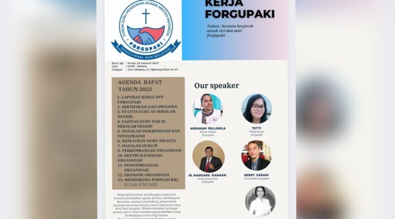Jakarta, MZK News – Forum Guru Pandidikan Agama Kristen Indonesia (FORGUPAKI) hadir dalam memperjuangkan guru-guru Pendidikan Agama Kristen (PAK) memperoleh hak-haknya sebagai guru di sekolah-sekolah baik negeri maupun swasta dari pemerintah serta penyelenggara di Departemen Keagamaan Bimas Kristen.