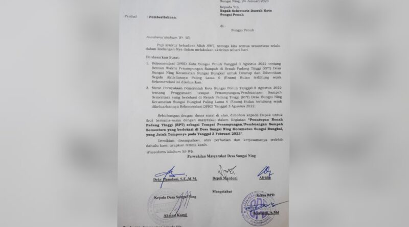 “Iya, betul kita bersama dengan Pak Kades, Pak Ketua BPD dan masyarakat Sungai Ning sudah memberitahukan kepada Pemkot. melalui Pak Sekda untuk bersama-sama menutup TPA RPT,” ujar Deki Hermawan Tokoh Masyarakat Sungai Ning ketika dikonfirmasi surat yang diperoleh wartawan mengenai ajakan penutupan TPA RPT (27/1/23).