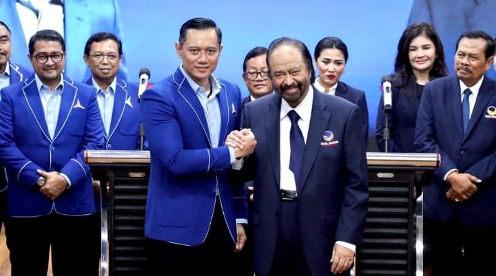 Foto: Ketum Nasdem Surya Paloh berjabat tangan dengan Ketum Demokrat AHY (Foto: IST)