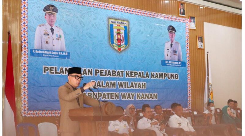 Bupati Adipati dalam sambutannya mengatakan, bahwa, Pelantikan Penjabat Kepala Kampung dilaksanakan untuk mengisi 32 Kepala Kampung yang telah habis masa jabatannya pada Tanggal 14 Februari 2023, untuk menjalankan Pemerintahan Kampung, sehingga dilantik Penjabat Kepala Kampung yang berasal dari Pegawai Negeri Sipil dilingkungan Pemerintah Kabupaten Way Kanan.