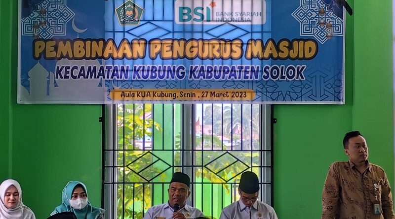 Kabupaten Solok, MZK News – Kepala Kantor Kementerian Agama Kabupaten Solok, H. Zulkifli, memberikan materi pembinaan kepada pengurus masjid se-Kecamatan Kubung di Aula Kantor Urusan Agama (KUA) Kubung, Senin (27/03/23).