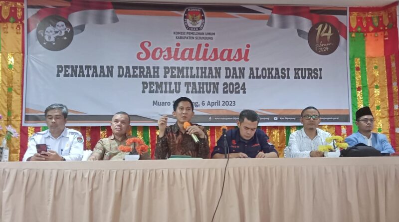 Lindo Karsyah selaku Ketua KPU Sijunjung menjelaskan Pemetaan Daerah Pemilihan dan Alokasi Kursi Tahun 2024 di hadapan para peserta sosialisasi melalui surat KPU RI Nomor : 249/PL.01.3-SD/05/2023, tanggal 16 Matet 2023 tentang Sosialisasi Daerah Pemilihan Dan Alokasi Kursi.