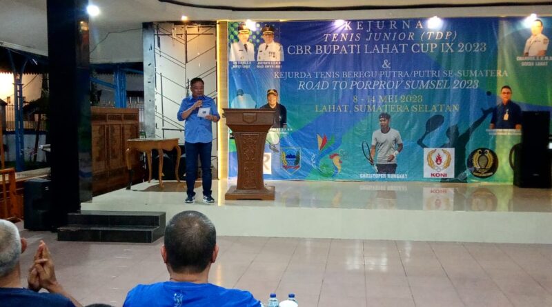 Foto: Bupati Lahat Cik Ujang memberikan kata sambutan di depan seluruh peserta kejurnas tenis junior (Foto: IST)