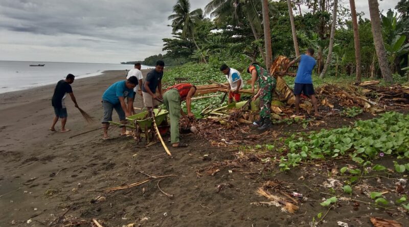 Babinsa Desa Sambiki Baru Bantu Masyarakat Bersihkan Pesisir Pantai