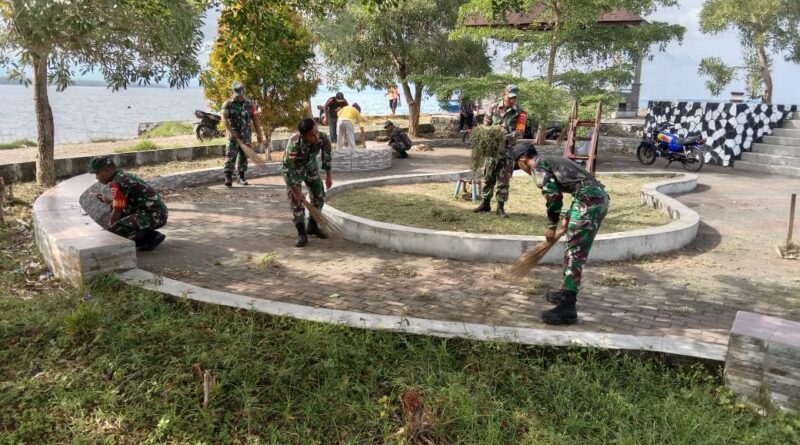 Foto: Anggota Koramil 1514-03/Wayabula Motori melakukan kerja bakti membersihkan pasar dan taman Wayabula (Foto: IST)