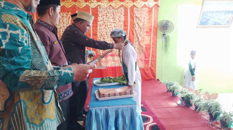 Foto: Ka. Kankemenag Kab. Solok memasangkan medali wisuda khatam kepada wisudawan didampingi Sekcam Bukit Sundi dan Kepala MPI (Foto: IST)
