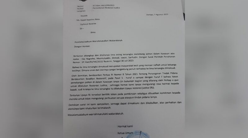 “Permohonan dilayangkan juga berdasarkan Perkap RI Nomor 8 Tahun 2021 tentang Penanganan Tindak Pidana Berdasarkan Keadilan Restoratif, pada Pasal 5 huruf a sampai huruf f bahwa kasus penebangan pohon di dalam kawasan tanpa izin bukan bagian yang dilarang Perkap a qou untuk dilakukan restorasi justice, sehingga hemat LSHM tanpa mengurangi rasa hormat terhadap Kepolisian Resort Bima, sudi kiranya ke lima tersangka tersebut dilakukan upaya restorasi justice,” ujarnya.