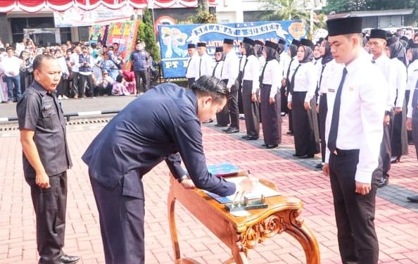 Foto: Plt. Bupati Kab Muara Enim sedang menandatangani berkas di penyerahan SK 1182 PPPK Guru dan Tenaga Teknis (Foto: IST)