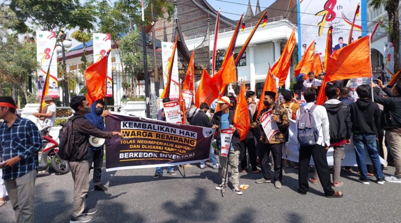 Terlihat dalam aksi tersebut para mahasiswa menyatakan pembelaan terhadap warga Rempang Batam yang saat ini terjadi konflik agraria antara Pemerintah dengan masyarakat Rempang.