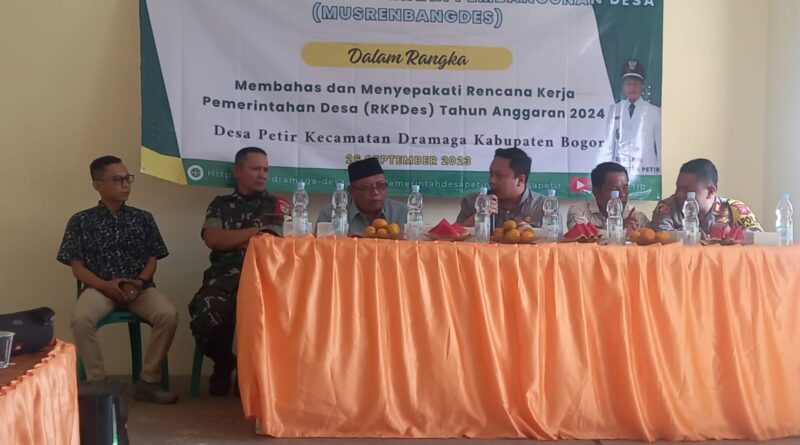 Kab. Bogor, MZK News – Kapolsek Dramaga, Polres Bogor AKP Budi Sehabudin menghadiri kegiatan Musyawarah Perencanaan Pembangunan Desa (Musrenbangdes) dalam Pembahasan Perencanaan Rencana Kerja Pemerintah Desa (RKPDes) TA. 2024 dan Daftar Usulan RKP Desa Tahun 2025 Desa Petir, Kecamatan Dramaga, Kabupaten Bogor yang diselenggarakan di Aula Serba Guna Kantor Desa Petir, Rabu (27/09/2023).