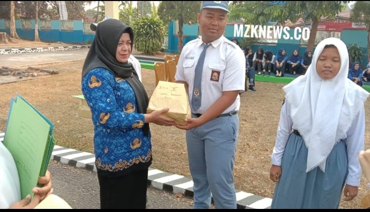 Foto: Kepala Sekolah SMKN 1 Lahat memberikan hadiah kepada Siswa Juara Lomba di HUT SMKN 1 Lahat ke-58 (Foto: IST)