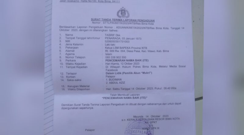 Tasrif mengatakan, bahwa laporan pengaduan telah diterima kepolisian dengan Surat Tanda Terima Laporan Pengaduan STTLP: K/887/IX/2023 NTB/ Res Bima Kota, atas dugaan penghinaan profesi LSM.