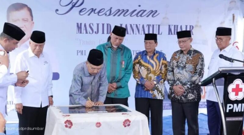 Foto: Wakil Ketua DPRD Sumbar Suwirpen Suib menyaksikan Ketum PMI Jusuf Kalla menandatangani prasasti saat peresmian Masjid Jannatul Khair PMI (Foto: IST)