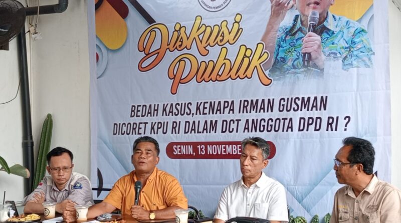 “Ada apa ini, tak ada hujan, tak ada badai dan tak ada tsunami, Calon kami Pak Irman Gusman dicoret dari DCT DPD RI,” ujar Marhadi Effendi pada diskusi publik bedah kasus Kenapa Irman Gusman Dicoret KPU RI? Senin (13/11-2033) di Kopigo Padang.