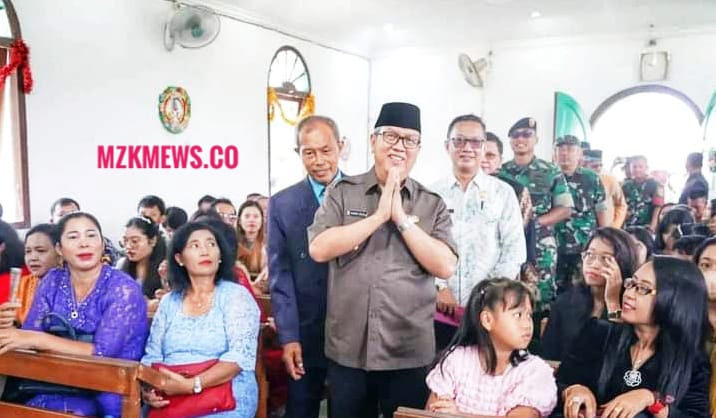 Muara Enim, MZK News – Pj. Bupati Muara Enim H. Ahmad Rizali bersama Danyonkav 5 Serbu Dwi Pangga Cetta, Mayor Kav. Fredy Christoma Pramono Putra meninjau perayaan ibadah Natal di Gereja Protestan Indonesia Bagian Barat (GPIB) Karunia di Desa Karang Endah, Kecamatan Gelumbang, Senin (25/12/2023).