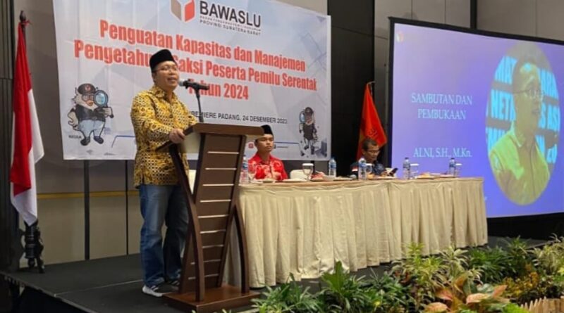 Padang, MZK News – Badan Pengawas Pemilihan Umum (Bawaslu) Provinsi Sumatera Barat menggelar kegiatan Penguatan Kapasitas dan Manajemen Pengetahuan Saksi Peserta Pemilu Serentak Tahun 2024 di Hotel Santika Premiere Padang pada, Senin (25 Desember 2023).