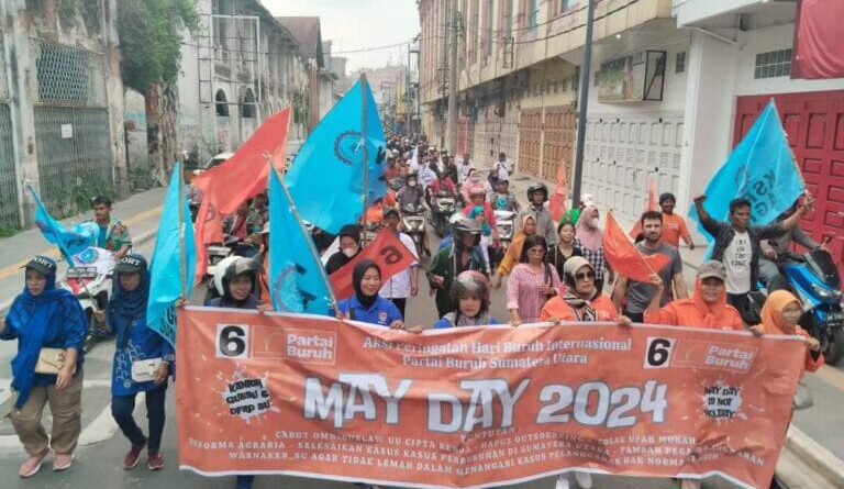 Medan, MZK News – Peringati Hari Buruh Internasional atau May Day 2024, Seratus Dua Puluhan aksi massa dari Executive Comitee (Exco) Partai Buruh Provinsi Sumatra Utara menggelar unjuk rasa yang dinamai Aksi Simpati May Day 2024 di 2 (Dua) titik lokasi berbeda di Kota Medan, Rabu (01/05/2024).