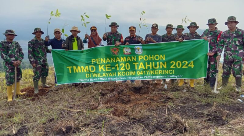 Kerinci, MZK News – TMMD ke-120 Kodim 0417/Kerinci selain realisasi program infrastruktur, kegiatan TMMD yang lain juga dikebut, yaitu menanam pohon bersama warga Desa Belui Tinggi, Sabtu (01/06/2024).