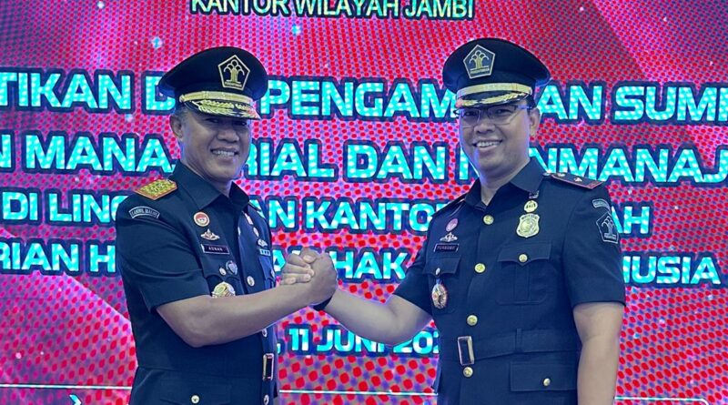 Jambi, MZK News – Bertempat di Aula Kantor Kementerian Hukum dan HAM Jambi dilaksanakan Acara Pelantikan dan Pengambilan sumpah jabatan manajerial dan non manajerial di lingkungan Kantor Wilayah Kementerian Hukum dan HAM Jambi yang dipimpin oleh Kepala Kantor Wilayah Kemenkumham Jambi Bapak M. Adnan, Selasa (11/06).