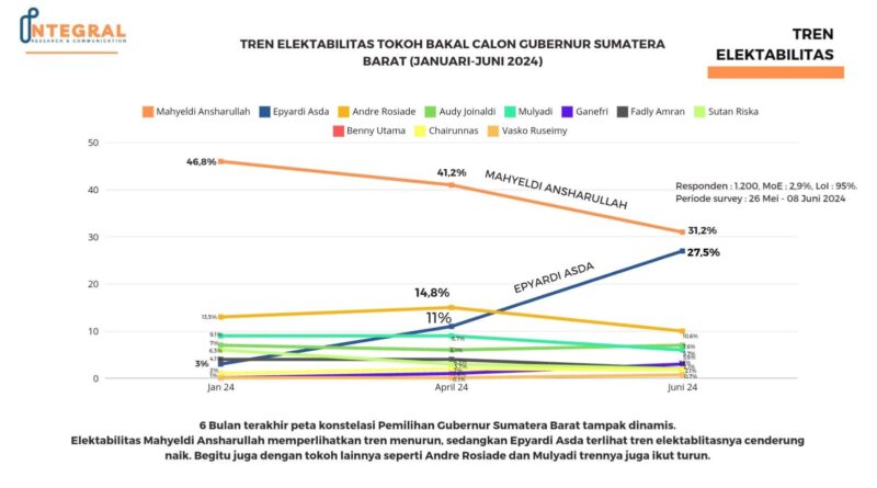 Hal itu terungkap dalam survei tingkat keterpilihan calon gubernur pilihan publik yang dilakukan Integral Research and Communication. Survei itu merekam tingkat elektabilitas Mahyeldi hanya sebesar 31,2 persen.