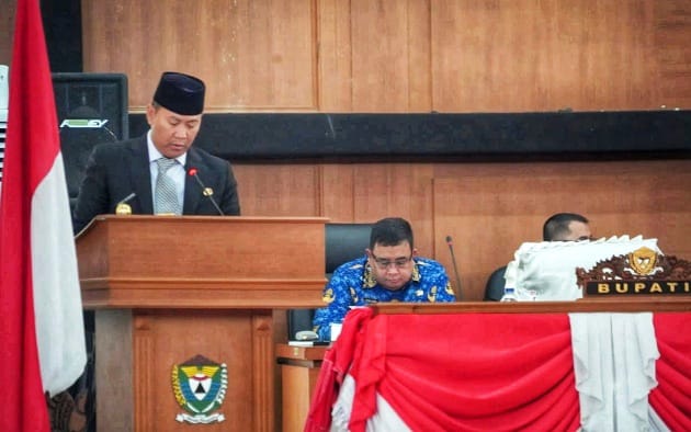 Foto: Pj. Bupati Muara Enim, H. Henky Putrawan saat memaparkan Rancangan Perubahan KUA dan PPAS Kab. Muara Enim TA 2024 pada Sidang Paripurna VII DPRD (Foto: IST)