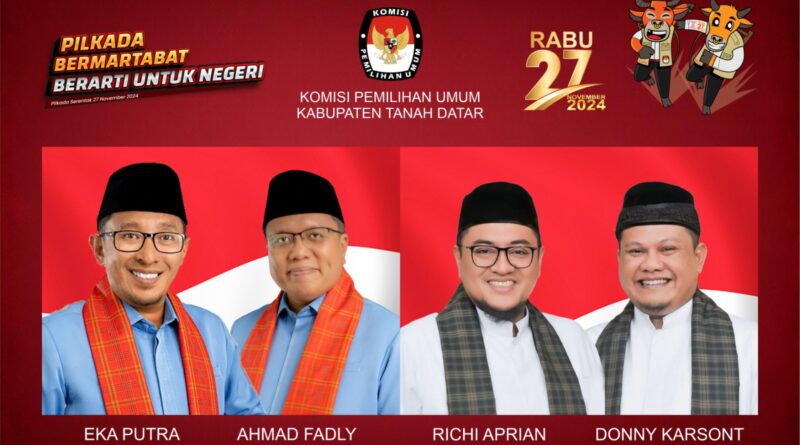 Batusangkar, MZK News – Komisi Pemilihan Umum (KPU) Tanah Datar menetapkan Eka Putra-Ahmad Fadly dan Richi Aprian-Donny Karsont sebagai pasangan calon Bupati dan Wakil Bupati Tanah Datar dalam Pemilihan Serentak Nasional 2024.