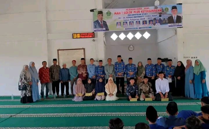 Kabupaten Solok, MZK News – Pemerintah Daerah Kab. Solok melepas secara resmi tujuh orang siswa berprestasi MAN 1 Solok Plus Keterampilan untuk melanjutkan studi ke Kairo, Mesir. Acara pelepasan dilaksanakan di Masjid Jabal Nur MAN 1 Solok, Kamis (17/10/2024).